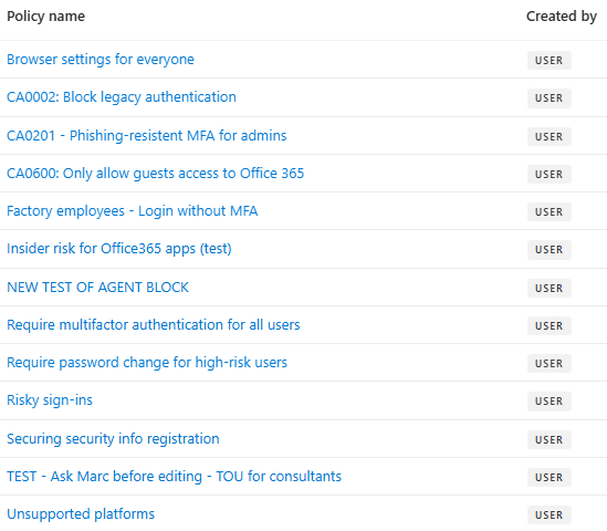 Microsoft-managed policies and template-based policies often use sentence-like names (for example, “Block legacy authentication”). These are readable but can become inconsistent when targeting specific apps, locations, or personas.