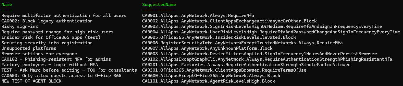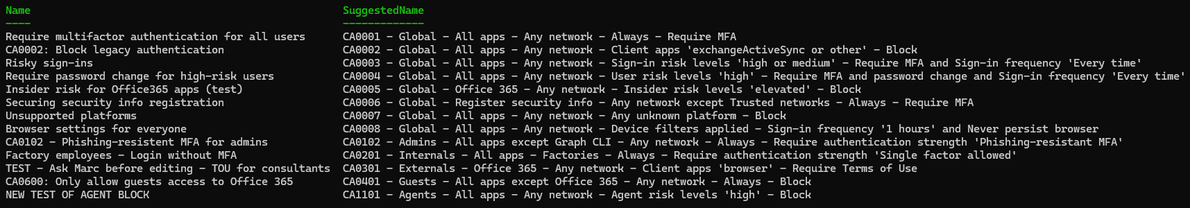 A naming standard helps, but names can drift as policies change - or administrators might not follow the standard. To address this, I created Get-ConditionalAccessPolicyNameSuggestion.ps1 which can be found in my repository at https://github.com/kovergard/ConditionalAccess/tree/main/Naming